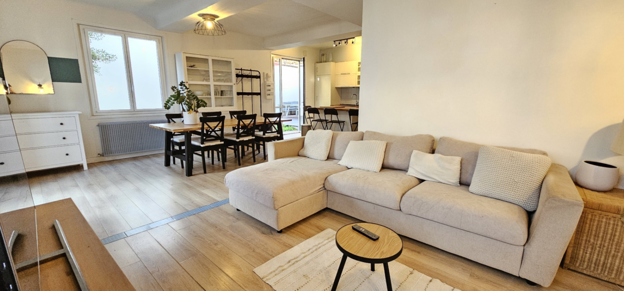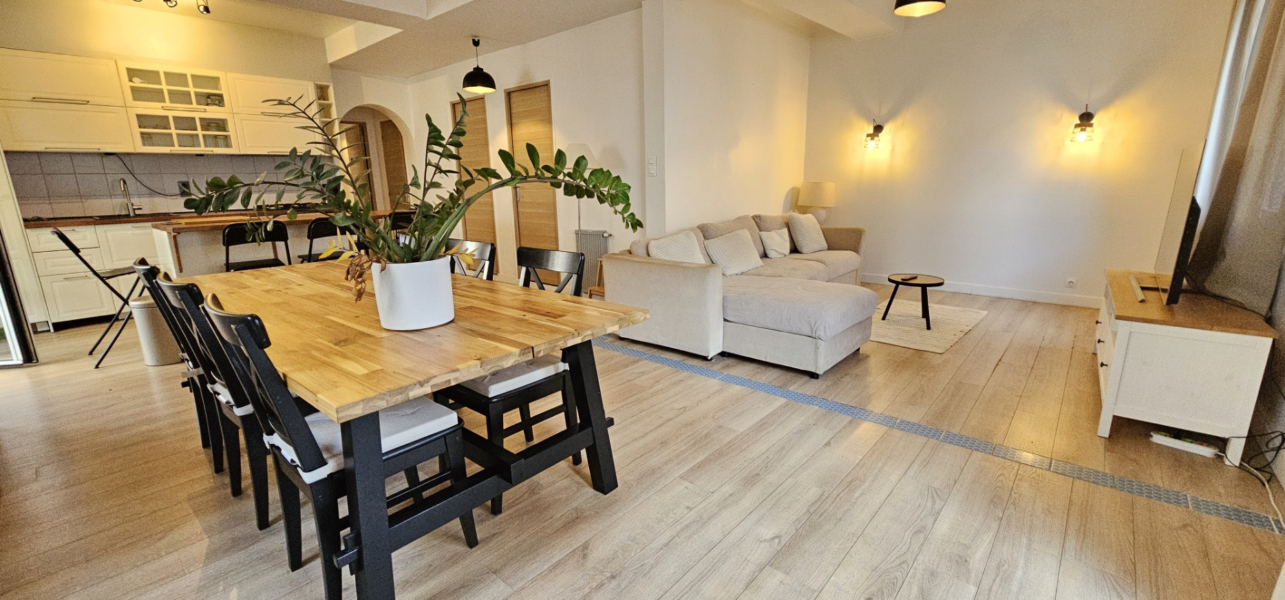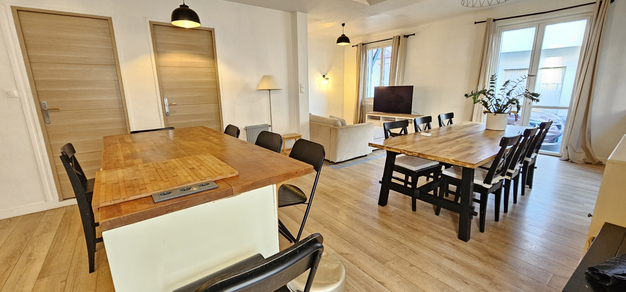 L’accès à cet appartement meublé se fait de manière confidentielle par le jardin et la terrasse. La porte d’entrée ouvre ensuite sur un magnifique séjour double avec cuisine aménagée et équipée, un cellier une salle d’eau et un wc. Le couloir dessert ensuite trois belles chambres ainsi qu’une deuxième salle d’eau avec wc.