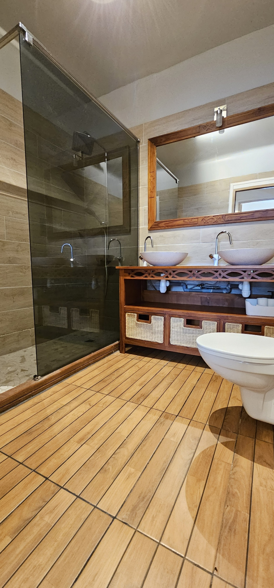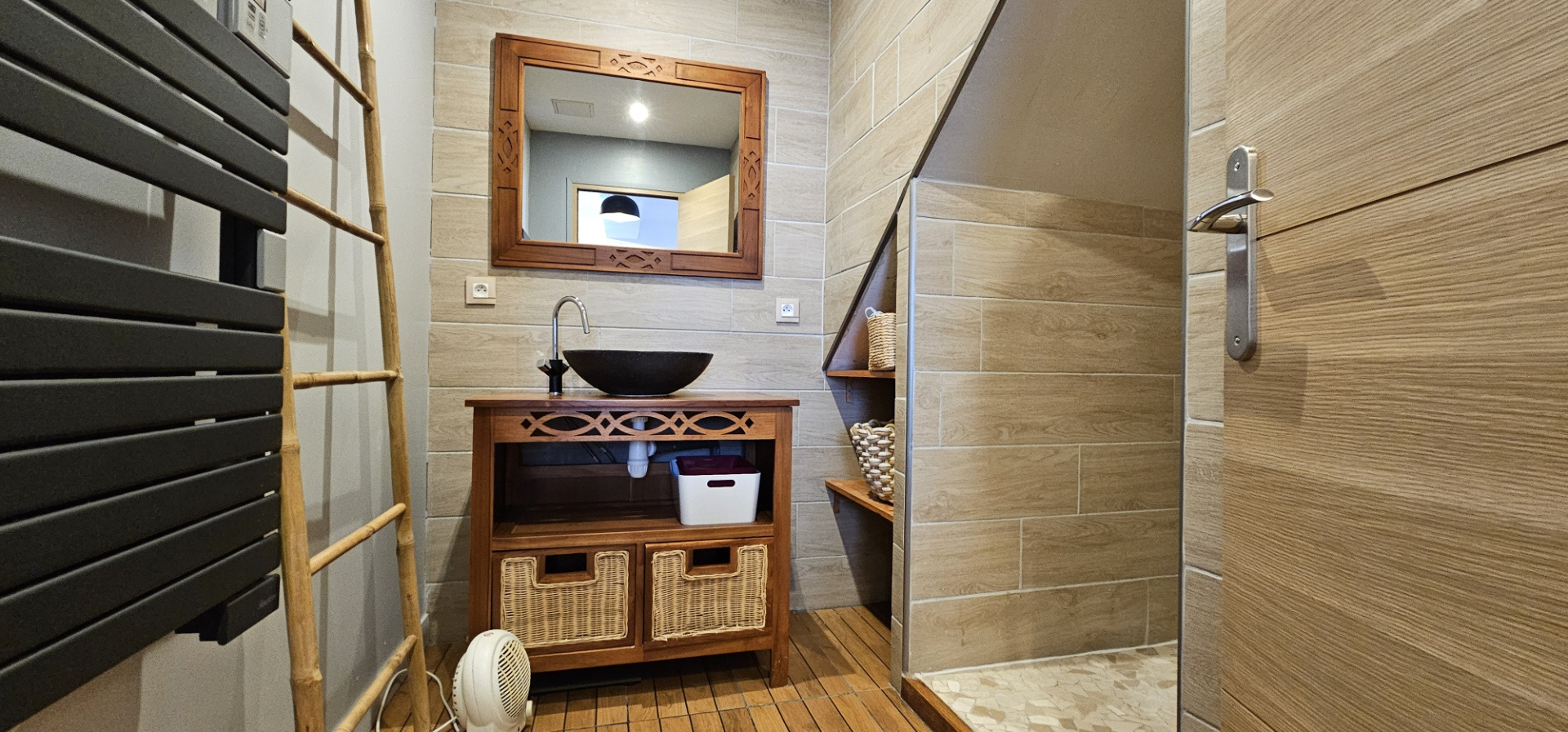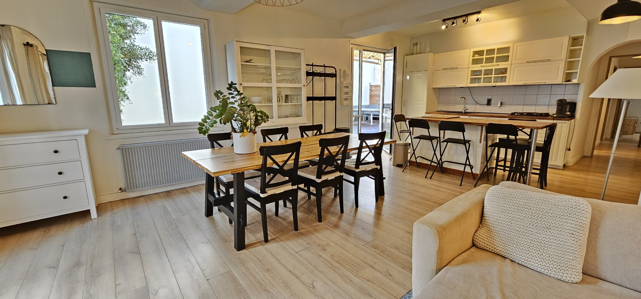 L’accès à cet appartement meublé se fait de manière confidentielle par le jardin et la terrasse. La porte d’entrée ouvre ensuite sur un magnifique séjour double avec cuisine aménagée et équipée, un cellier une salle d’eau et un wc. Le couloir dessert ensuite trois belles chambres ainsi qu’une deuxième salle d’eau avec wc.