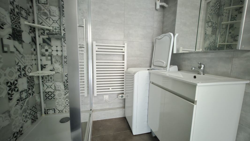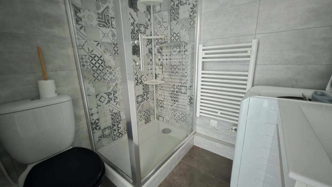Il se compose d’une entrée sur dégagement desservant un séjour avec cuisine aménagée et équipée donnant sur une belle terrasse, une salle d’eau avec wc.