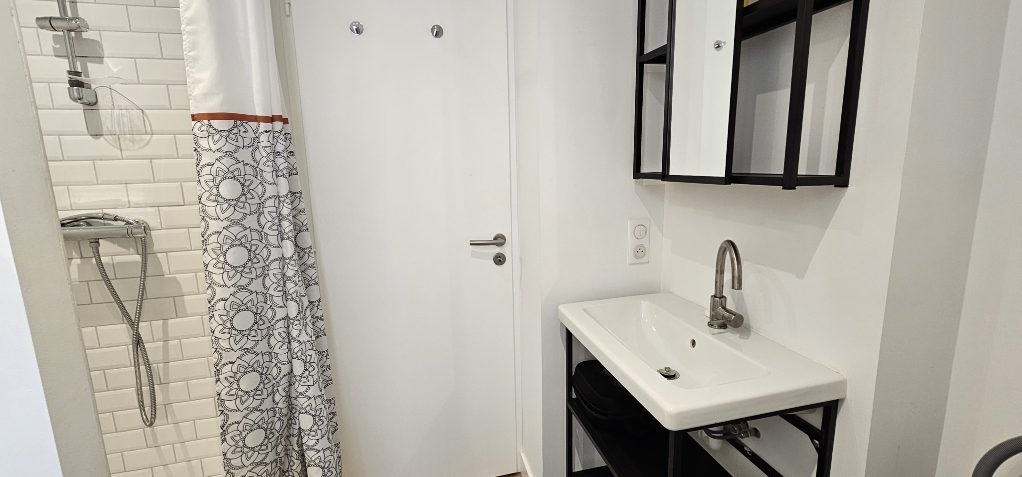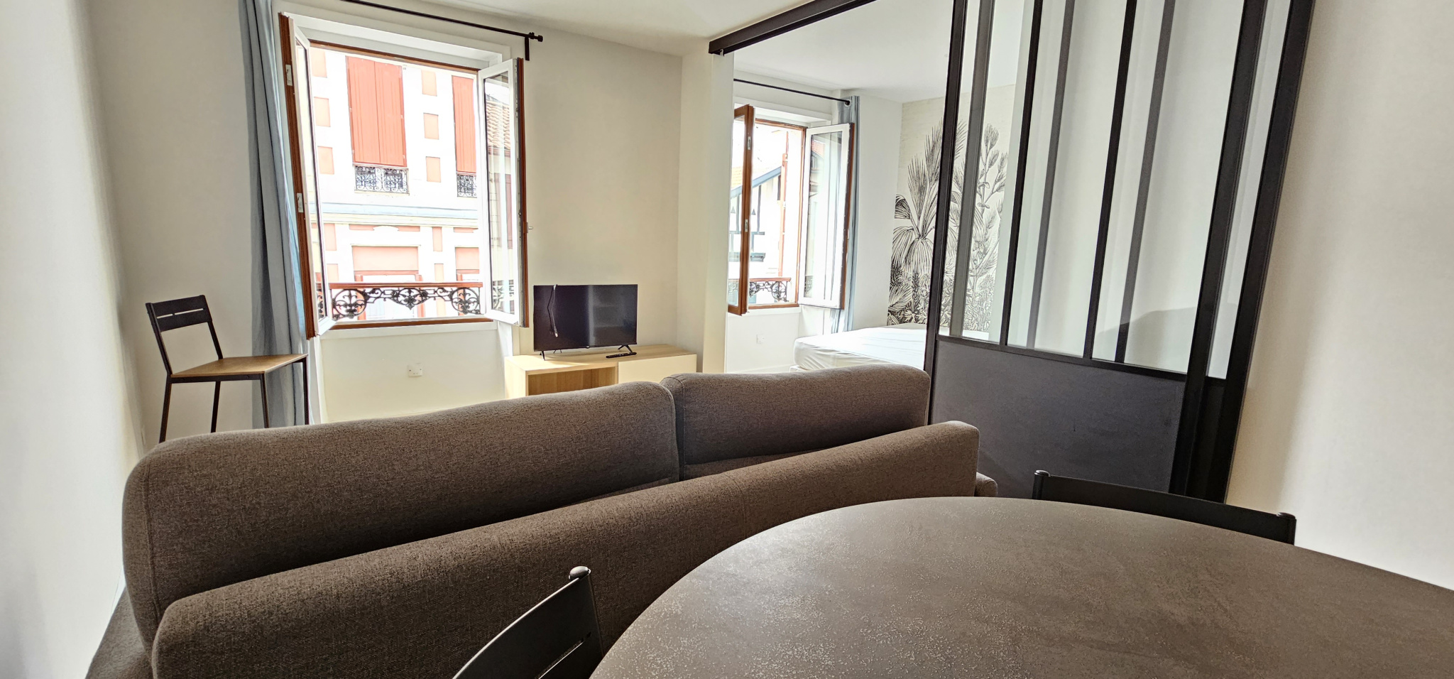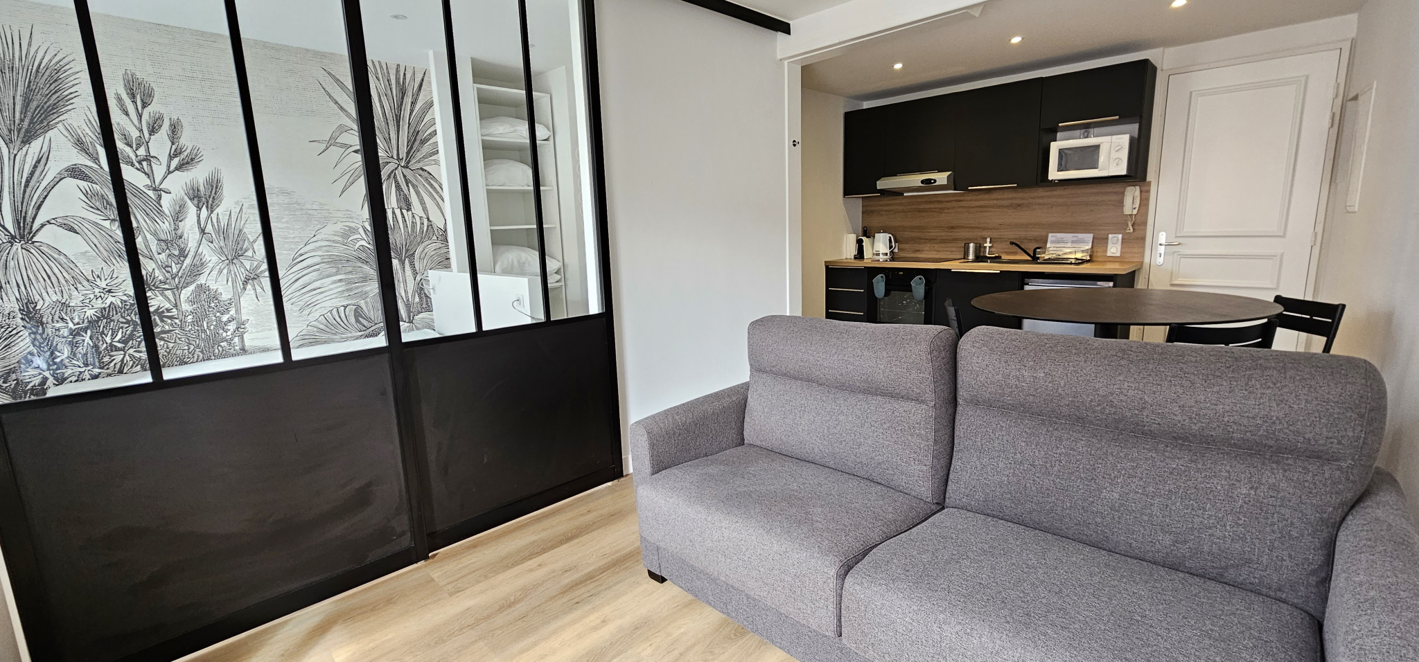 Magnifiquement rénové et décoré, il se compose d’une entrée sur séjour avec cuisine aménagée et équipée séparée par une verrière coulissante, d’une alcove à usage de chambre comprenant un placard aménagé, puis une salle d’eau avec WC.