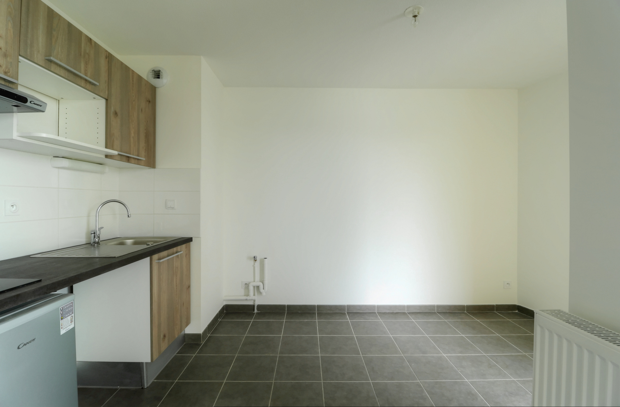 Il se compose d’une entrée sur séjour avec kitchenette aménagée et équipée d’une plaque deux feux, d’une hotte et d’un réfrigérateur top donnant sur une belle terrasse, une salle d’eau avec W.C.