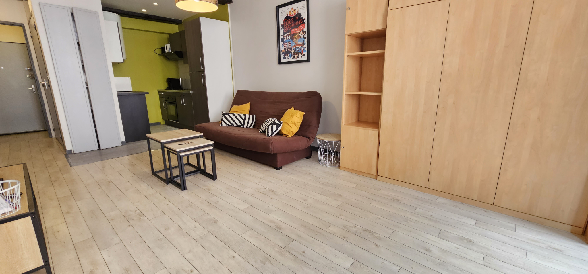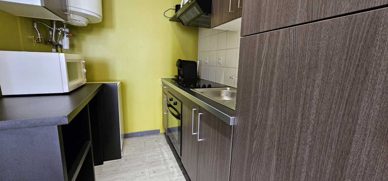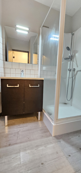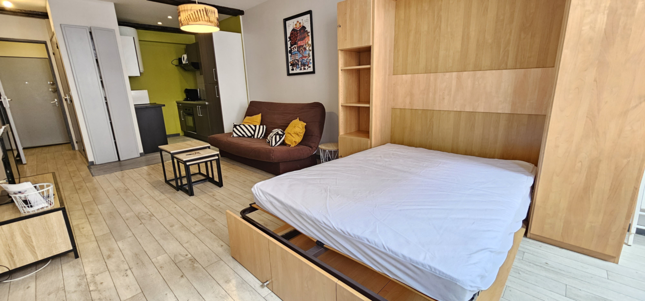 Il se compose d’une entrée sur dégagement desservant un séjour avec lit armoire et cuisine aménagée et équipée et une salle d’eau avec W.C.