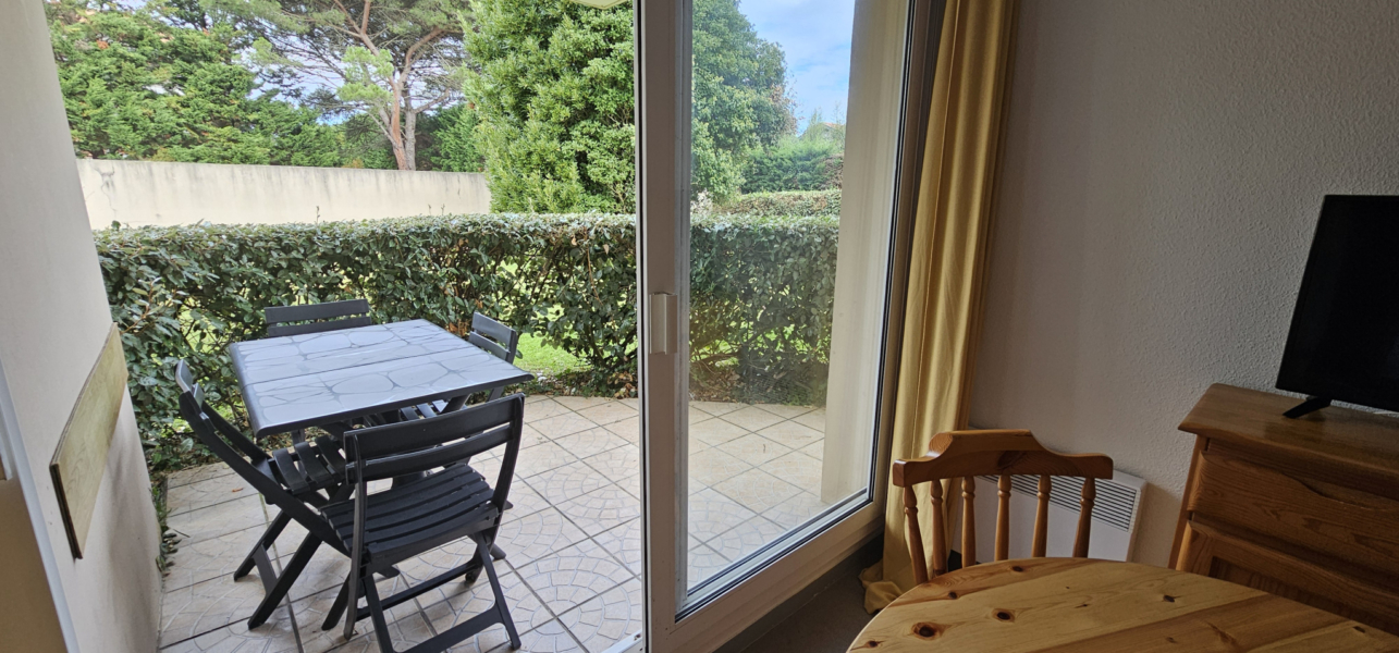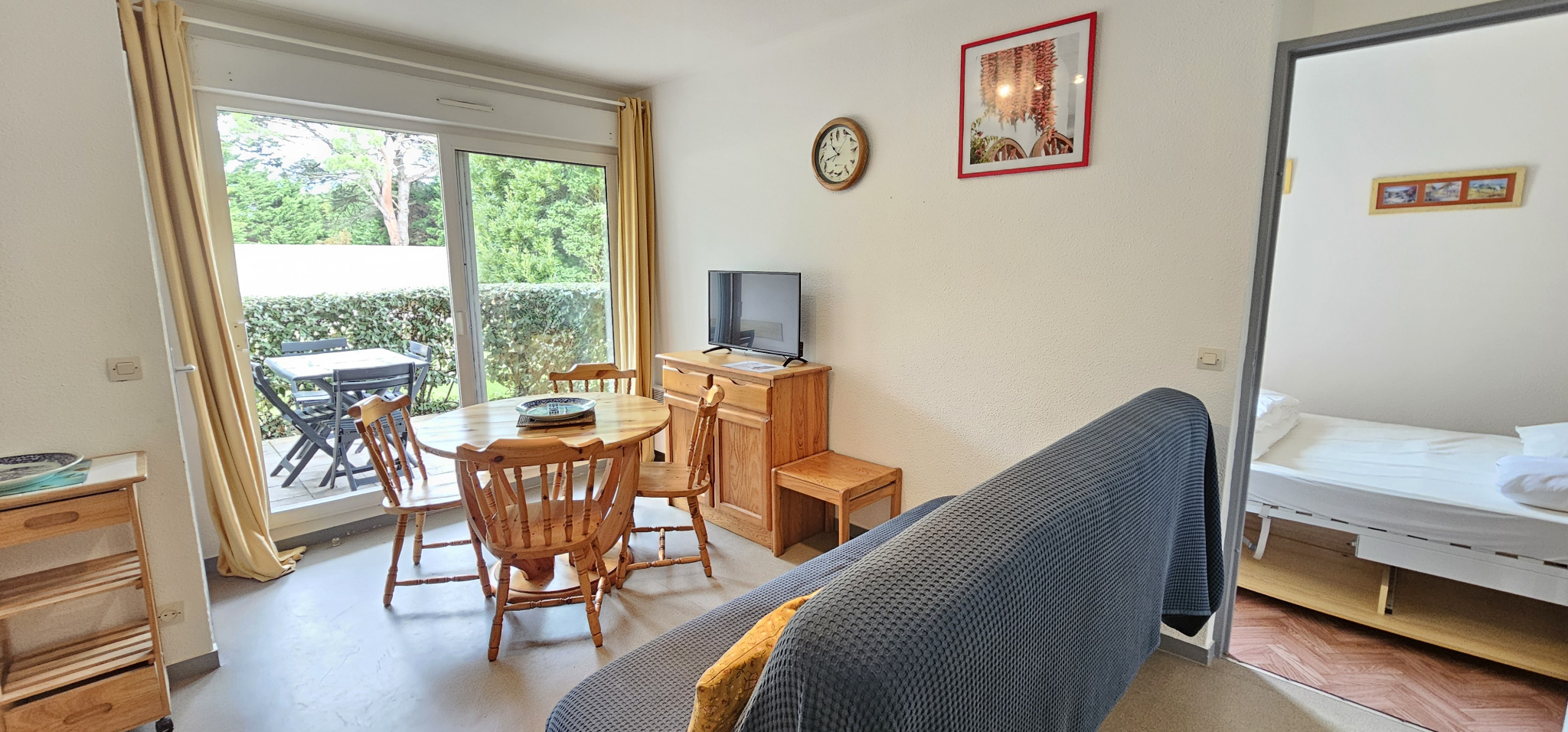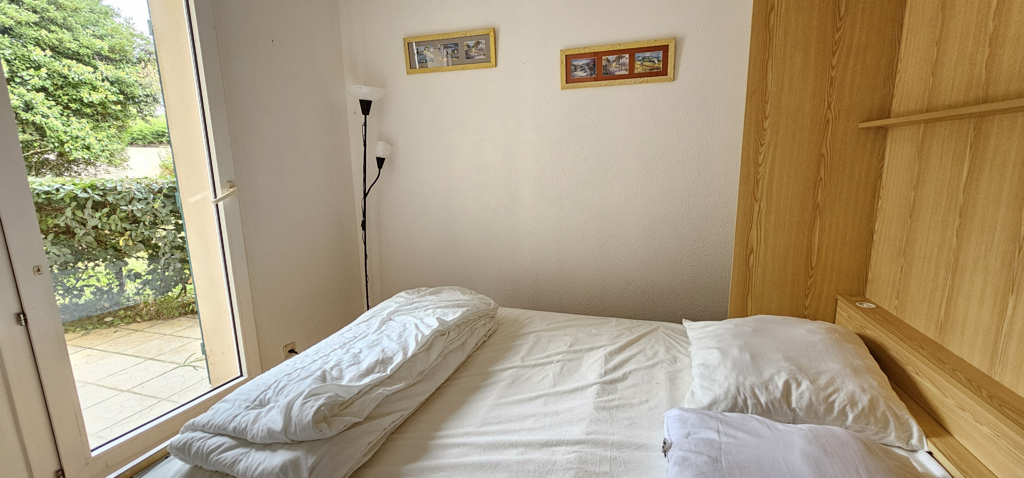 Il se compose d’une entrée sur dégagement desservant un séjour donannt sur une belle terrasse au calme avec kitchenette aménagée, d’une salle de bains, d’un wc séparé et de deux alcoves indépendantes pourvues pour chacune d’un lit et de rangements.