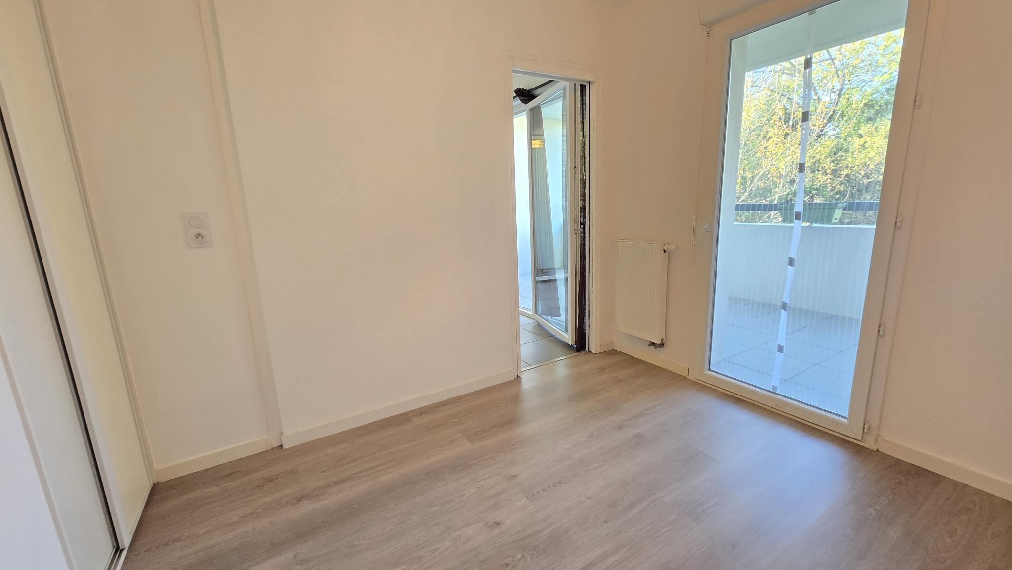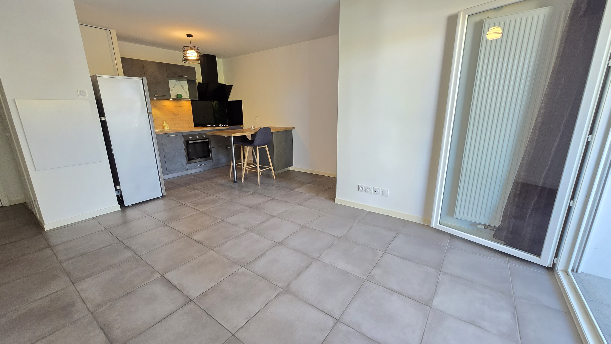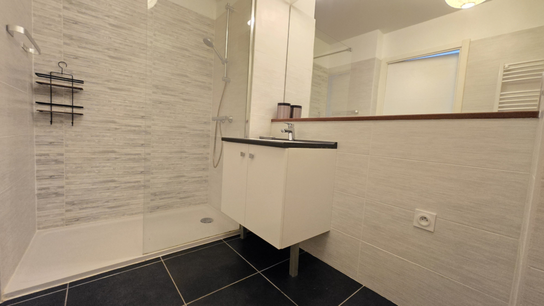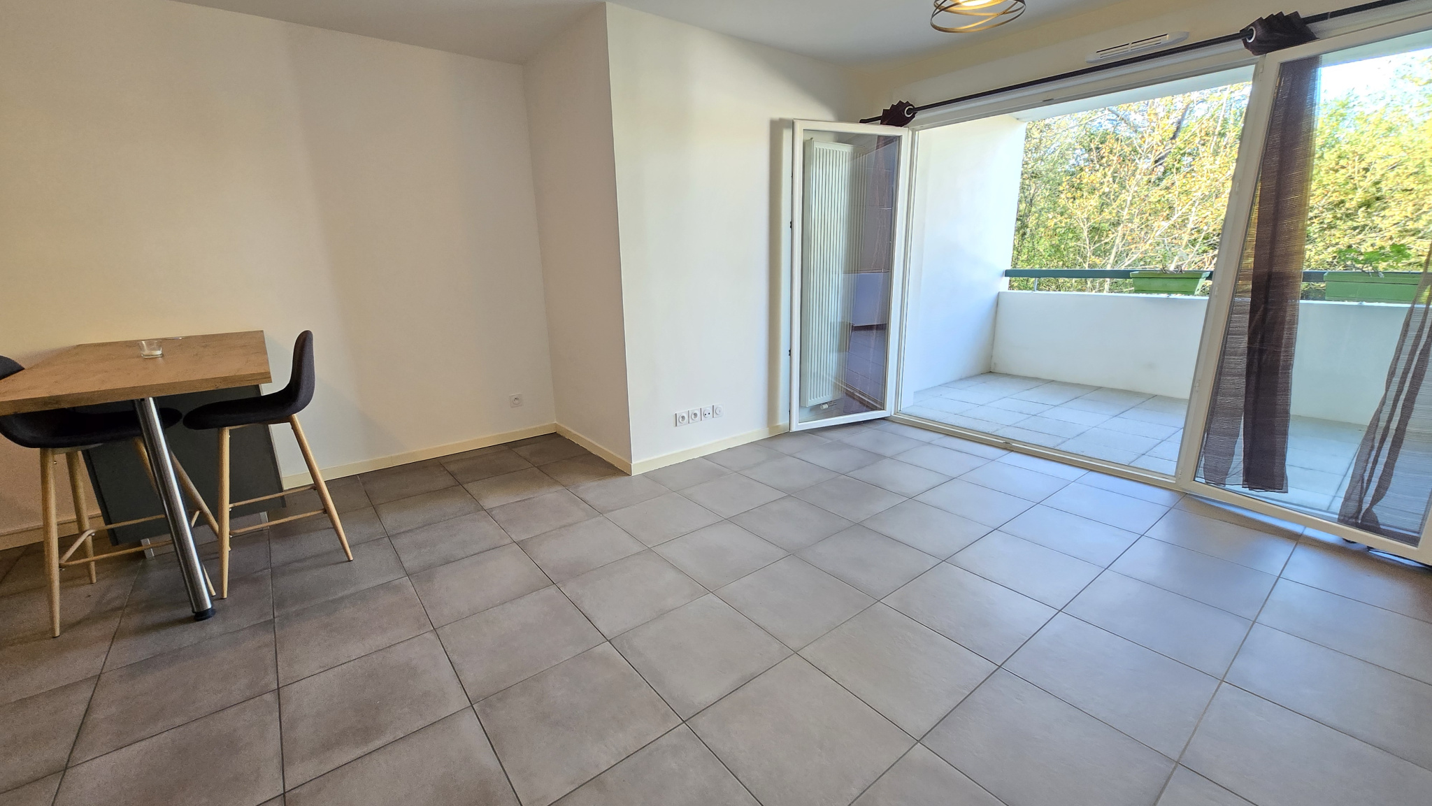 Il se compose d’une entrée avec placard desservant un beau séjour avec cuisine aménagée sur terrasse, une chambre avec placard donnant également sur la terrasse et une salle d’eau avec wc.