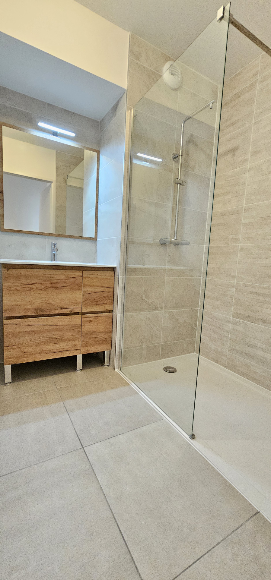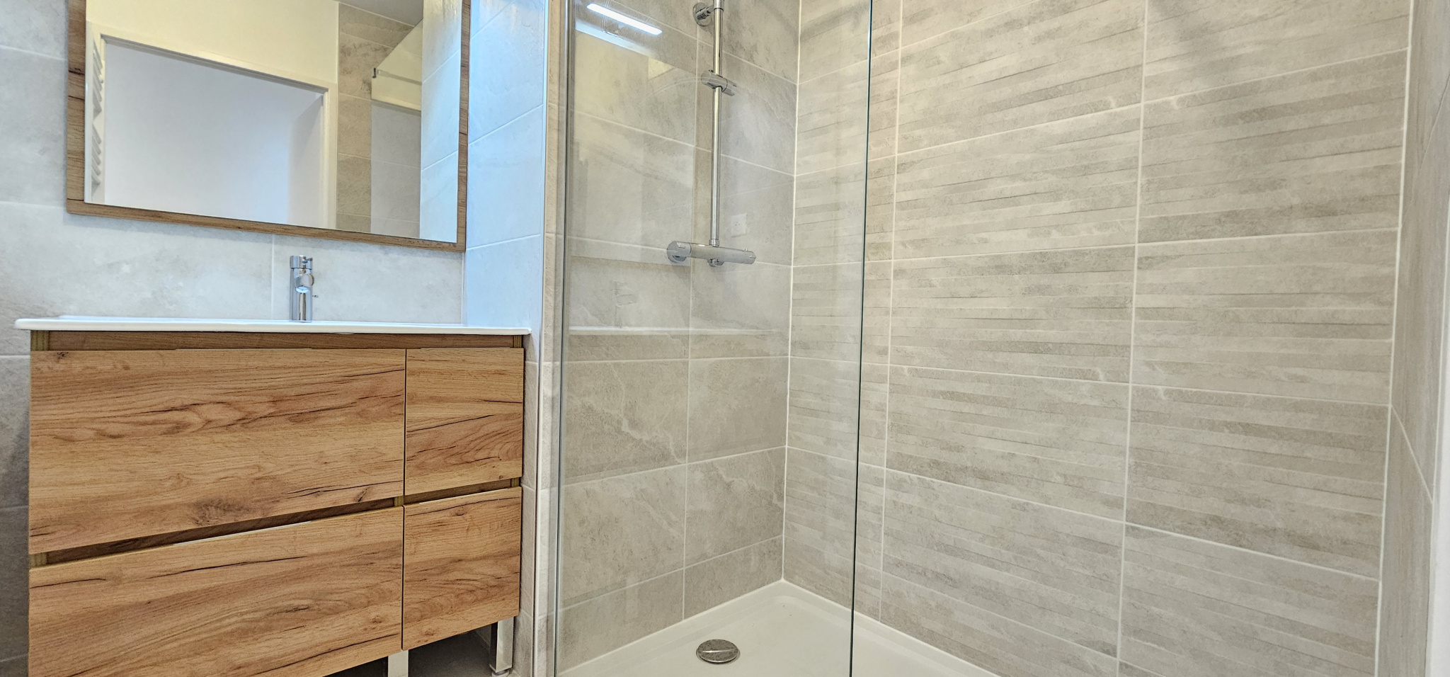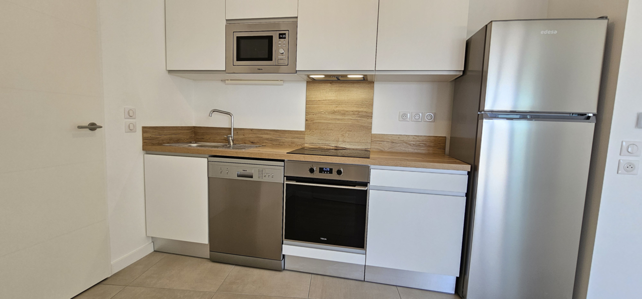 Il se compose d’une entrée sur un beau séjour avec cuisine aménagée et entièrement équipée (le reste de l’électroménager sera livré avant la fin du mois de juillet), le tout exposé à l’ouest et donnant sur une superbe terrasse de 10 m2, d’un cellier avec branchement machine à laver, d’un couloir desservant une belle salle d’eau, un wc séparé et une chambre.