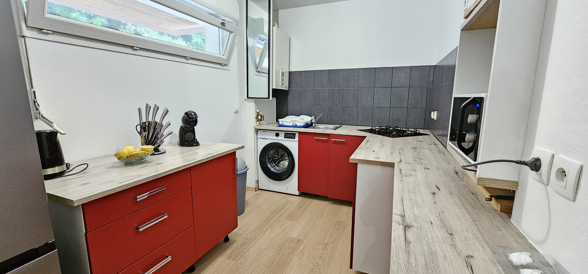 Il se compose d’une entrée sur dégagement avec placard desservant une salle d’eau, un wc séparé, un grand séjour avec cuisine aménagée et équipée, une chambre et une terrasse avec jardin clos.
