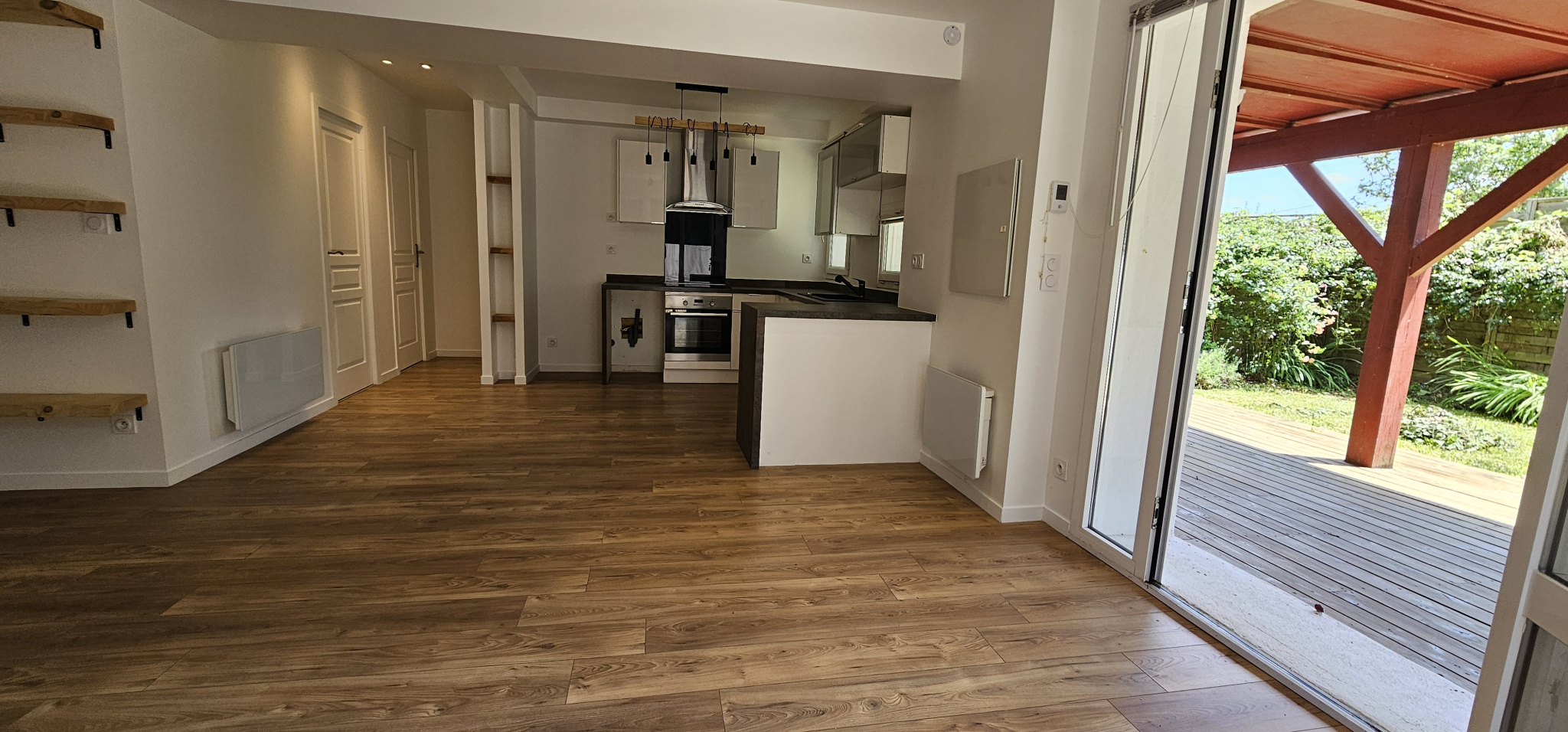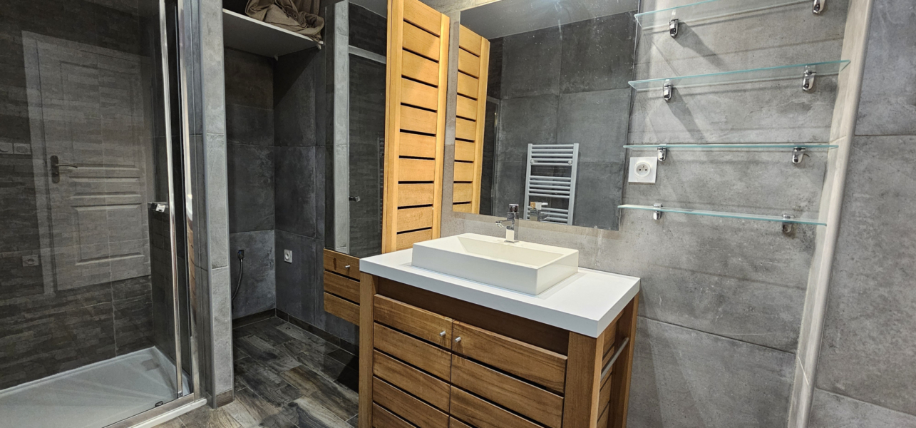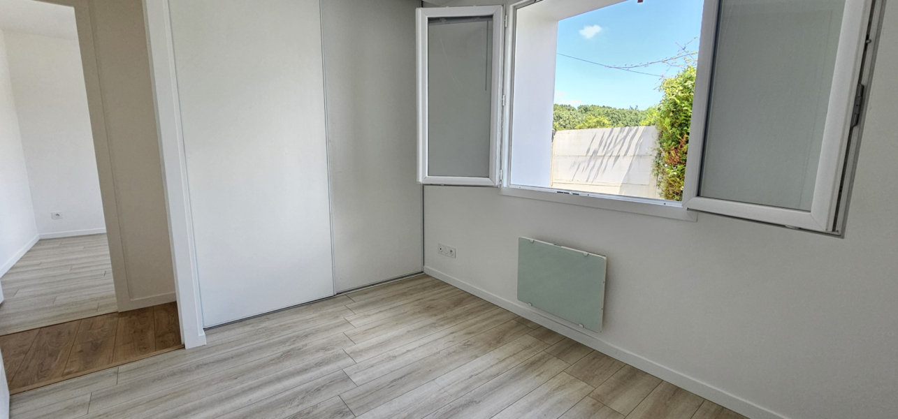 Il se compose d’une entrée sur une magnifique terrasse et son jardinet le tout exposé sud et permettant d’accéder directement au séjour avec cuisine américaine aménagée et semi-équipée, une salle d ‘eau avec wc et un dégagement desservant deux belles chambres avec placards aménagés.