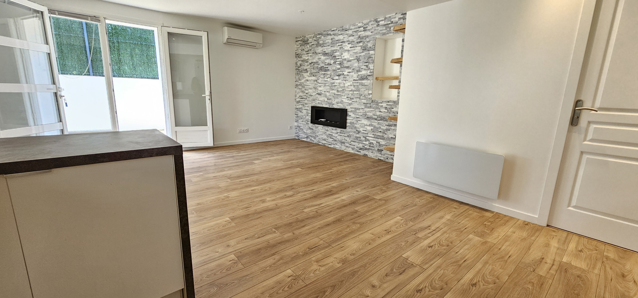 Le chauffage se fait principalement via une climatisation réversible. En cas d’hiver rigoureux, deux radiateurs dans les chambres viennent compélter ce système de chauffage très agréable et économique et les menuiseries sont bien sûr en double vitrage.
