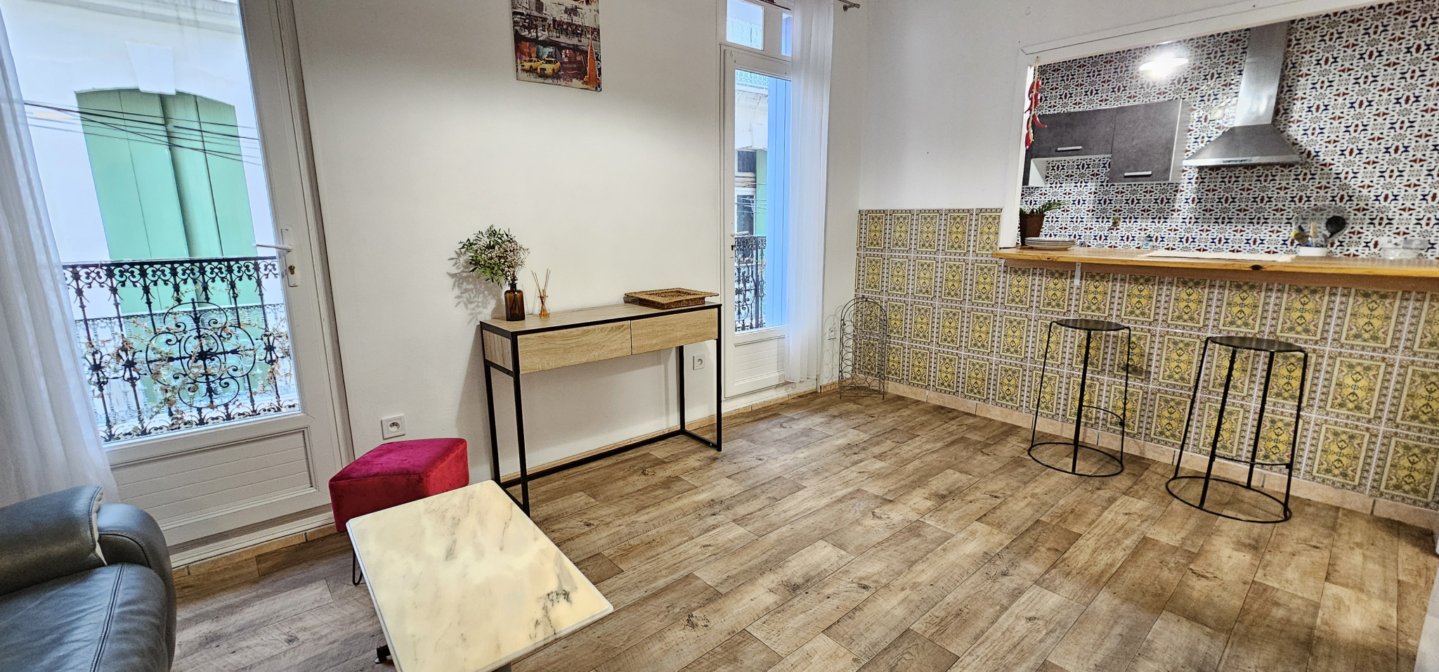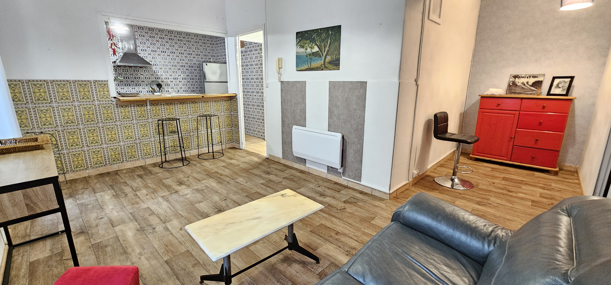 Climatisé ce bel appartement peut être loué VIDE ou MEUBLE. Il se compose d’une entrée desservant un séjour avec une belle cuisine américaine aménagée et équipée, d’une salle de bain, un wc et de deux chambres.