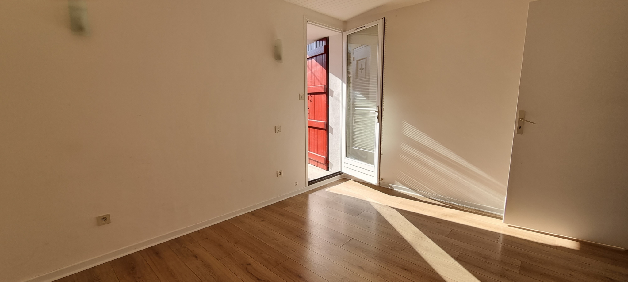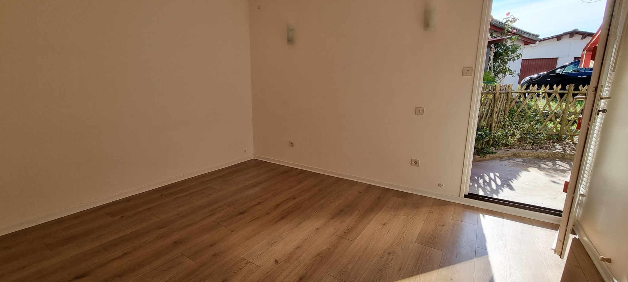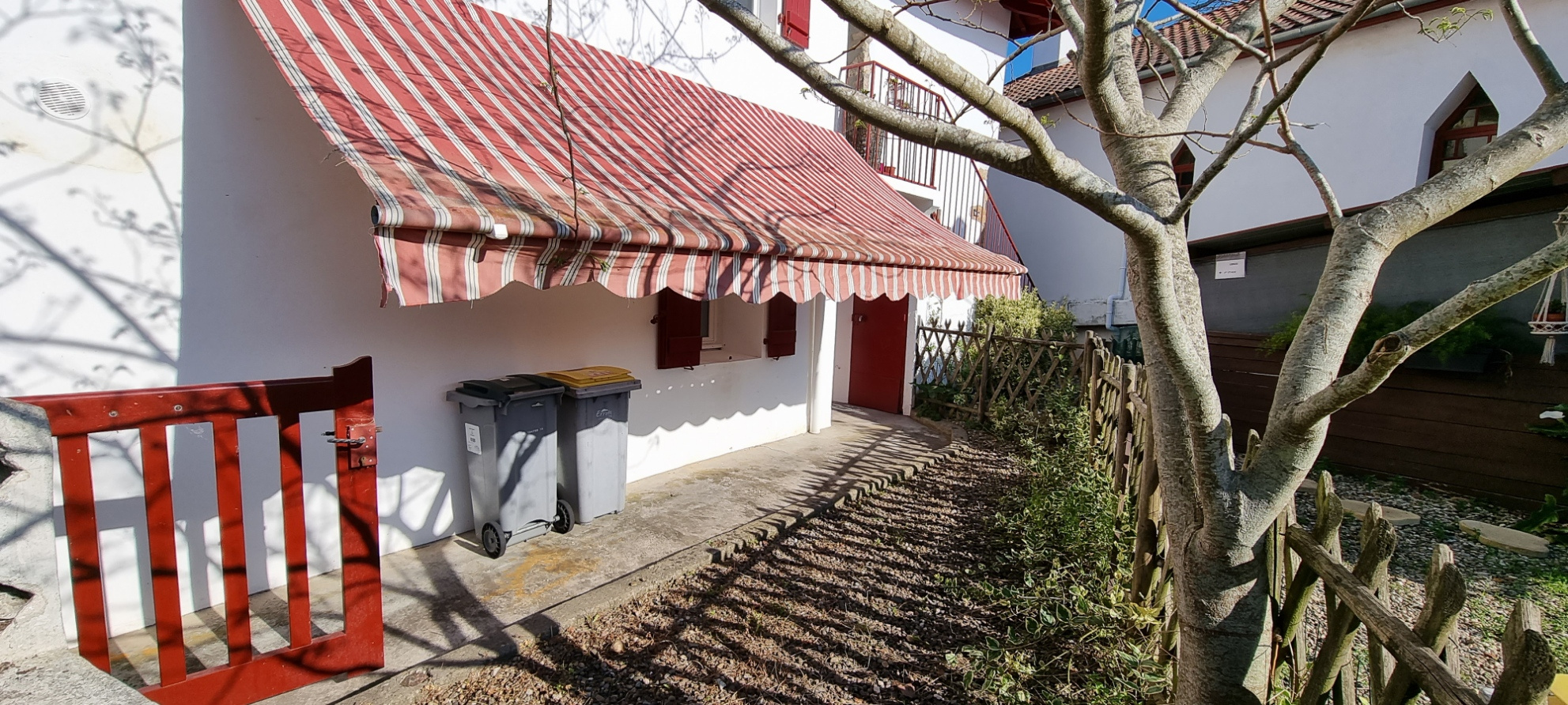 Un débarras sous l’escalier extérieur et une petite cour avec store banne.