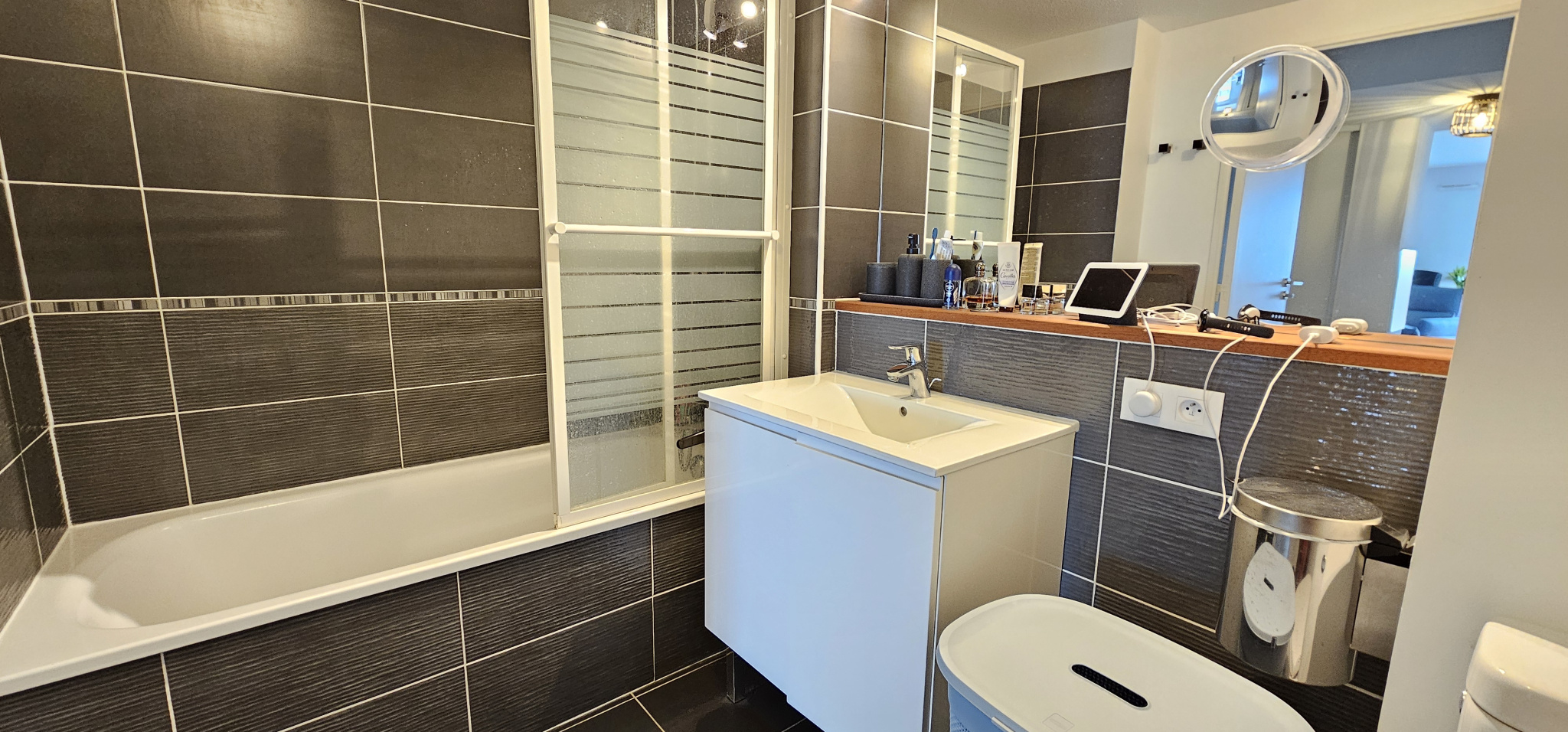 Il se compose d’une entrée sur dégagement avec placards desservant un séjour avec cuisine aménagée semi-équipée le tout donnant sur une belle terrasse d’environ, deux chambres dont une avec placard, une salle de bains avec wc.