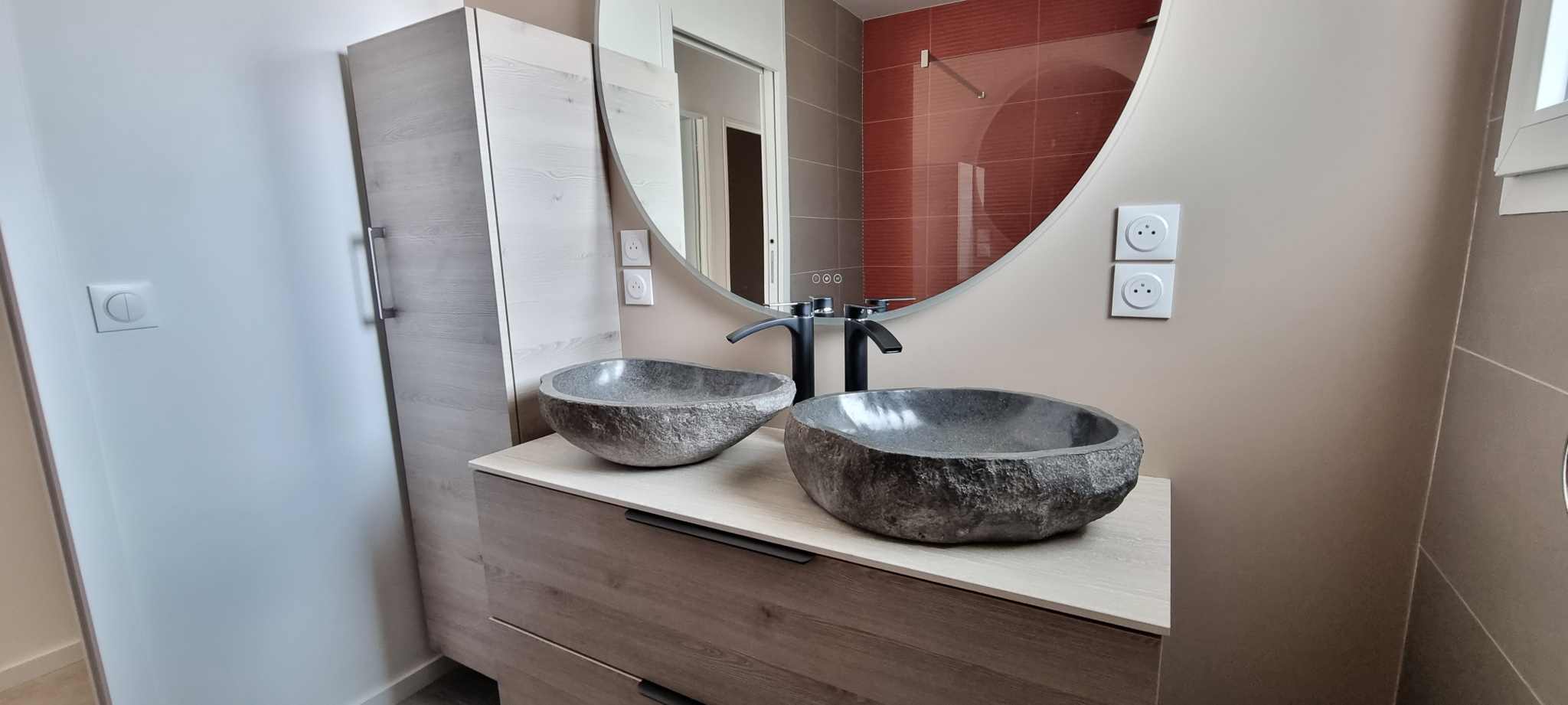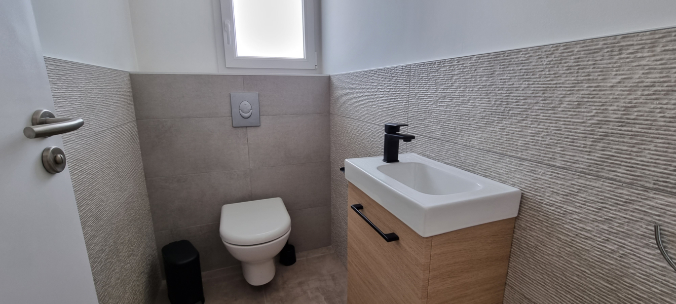 Elle se compose d’une entrée sur un magnifique séjour de 42m2 bénéficiant d’une superbe cuisine aménagée et entièrement équipée donnant sur une superbe terrasse de plus de 50m2. Le séjour ouvre sur un couloir desservant lui-même 3 chambres avec placards aménagés dont une suite parentale avec douche et vasque, un deuxième point d’eau composé d’une salle d’eau avec doubles vasques et douche à l’italienne, et un W.C. séparé avec lave-mains.