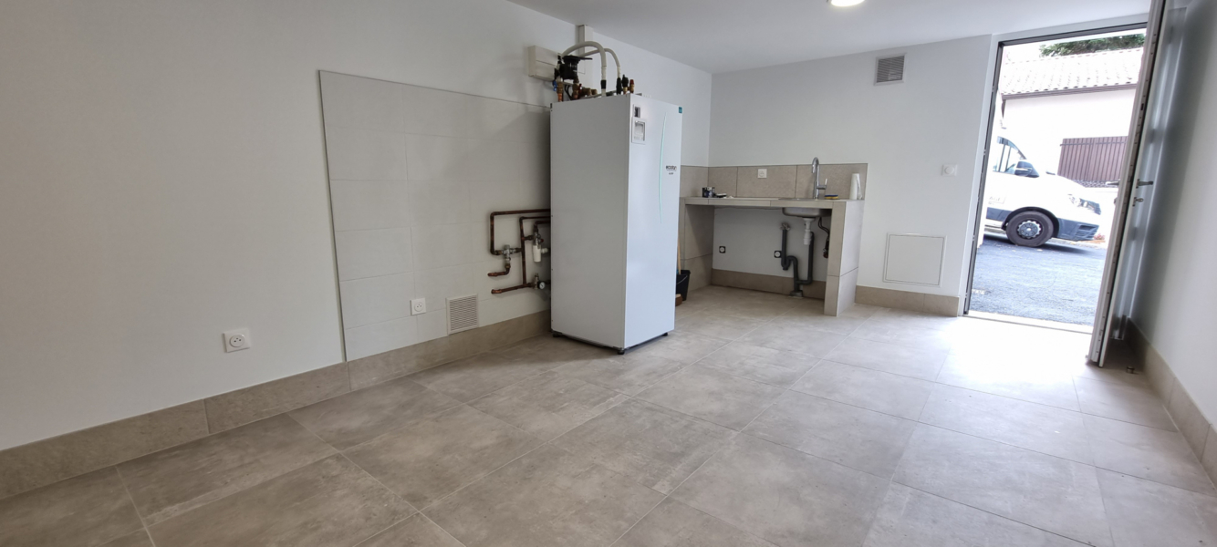 Un escalier permet l’accès au niveau inférieur composé d’une buanderie d’environ 20m2, un bureau de 10 m2 et un grand garage de 35m2 avec porte électrique.