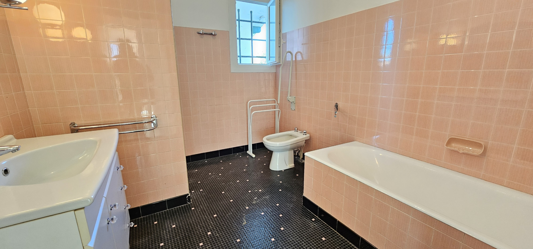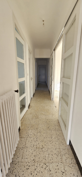 Elle se compose d’une entrée sur couloir desservant un séjour donnant sur une terrasse ensoleillée, une cuisine indépendante aménagée, une salle de bains avec baignoire et douche, de quatre chambres avec placards aménagés et d’un wc séparé avec lave-mains.