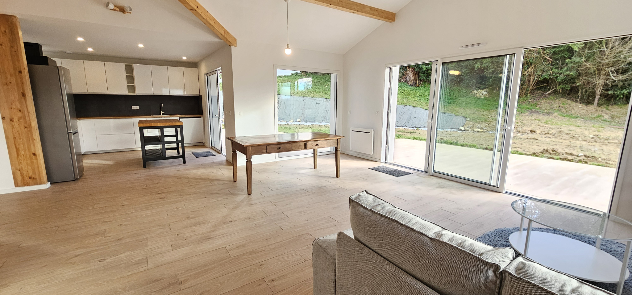 Le chauffage au sol se fait via une pompe à chaleur et les menuiseries sont en double vitrage.