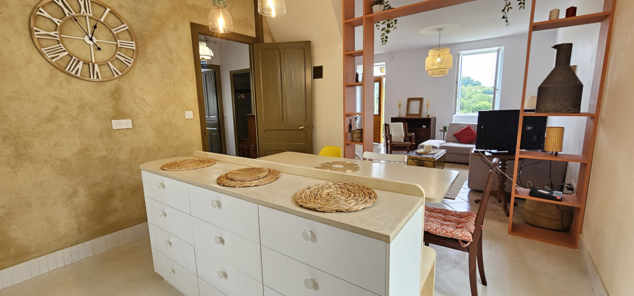 Elle se compose en rez-de-chaussée d’une entrée sur une splendide pièce à vivre composée d’un séjour avec cheminée ouvert sur une très belle cuisine américaine aménagée et équipée, d’un coin bureau, d’une salle d’eau et d’une pièce contigue pouvant faire office de chambre, buanderie etc… et d’un wc.