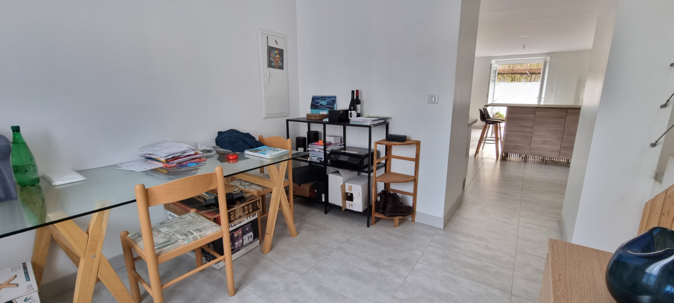 L’accès se fait via une petite cour permettant d’accéder au garage et à la maison en duplex qui se compose d’une entrée sur séjour avec cuisine aménagée semi-séparée du séjour par un comptoir, le tout donnant sur une terrasse et un joli jardin exposé sud. Une autre pièce à usage de bureau est située à la suite de la cuisine, ainsi qu’un W.C. complètent l’habitation du rez-de-chaussée.