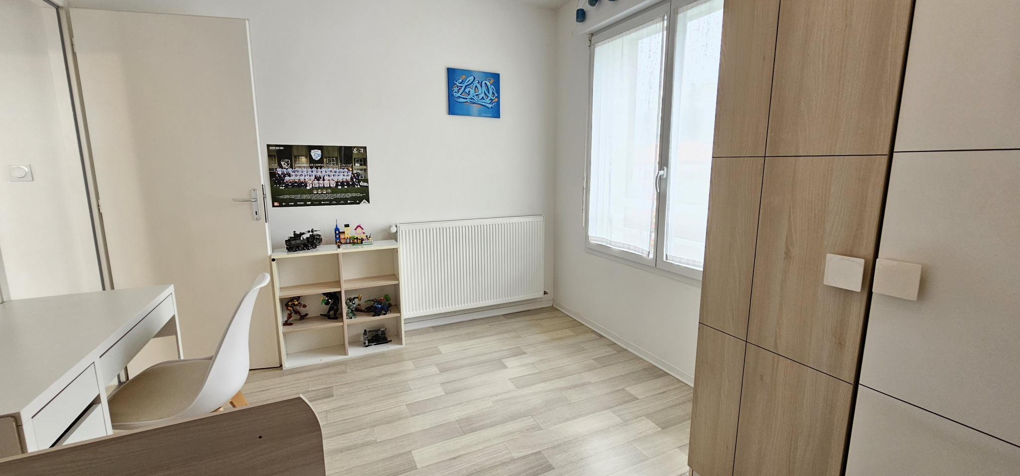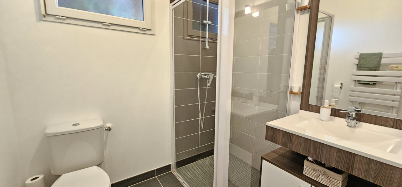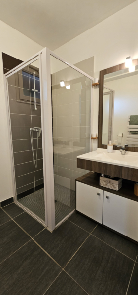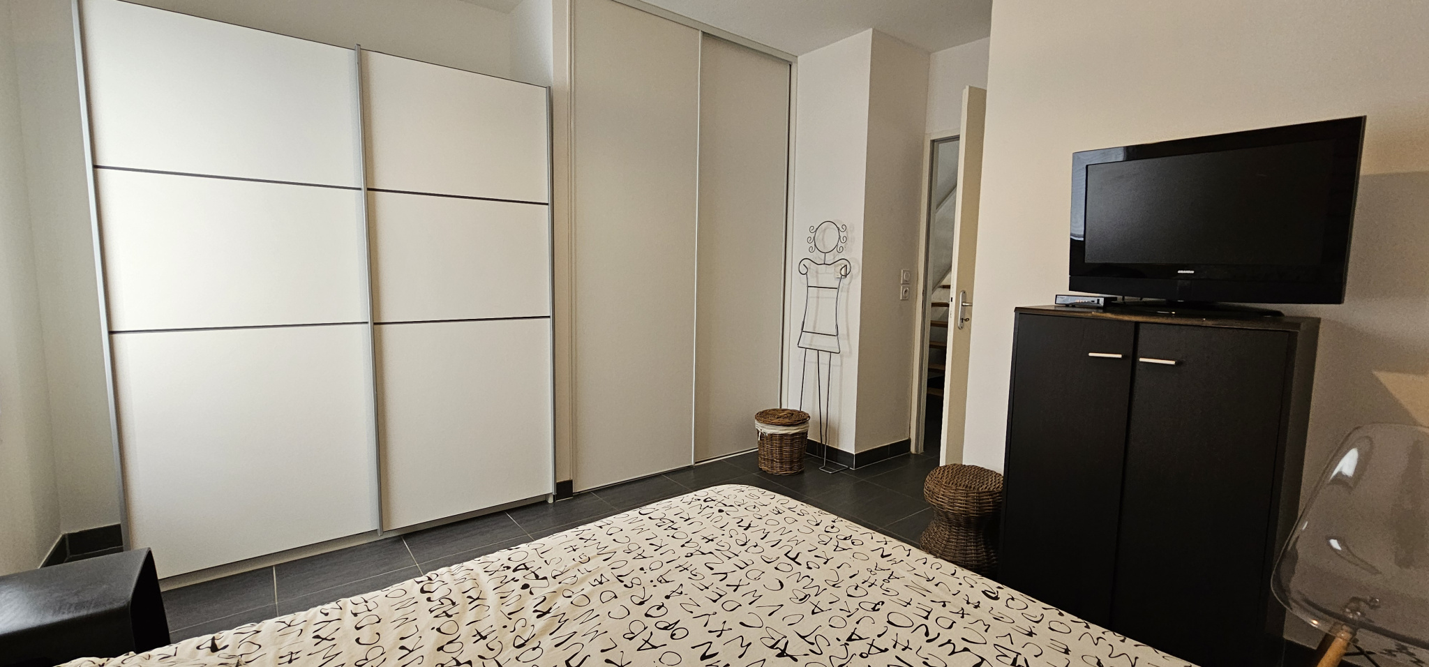 Egalement en rez-de-chaussée, une belle chambre et une salle d’eau avec wc ainsi qu’un cellier intérieur et un deuxième cellier accessible par l’extérieur.